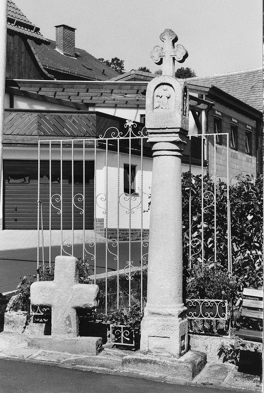 In Ortsmitte Steinkreuz und Bildstock aus Sandstein. Das schlichte Gedenkkreuz in Form eines niedrigen griechischen Kreuzes auf einer breiteren Basis. Der barocke Bildstock aus dem 18. Jh. in Form einer Säule auf einem quadratischen Sockel mit Diamantquader, laternenförmiger Aufsatz und Bekrönung durch ein lateinisches Kreuz mit kleeblattförmigen Abschlüssen In den leicht eingetieften Nischen des Aufsatzes barocke Heiligendarstellungen, u.a. der Evangelist Johannes, die farblich hell von dem roten Sandstein der Laterne abgesetzt sind.