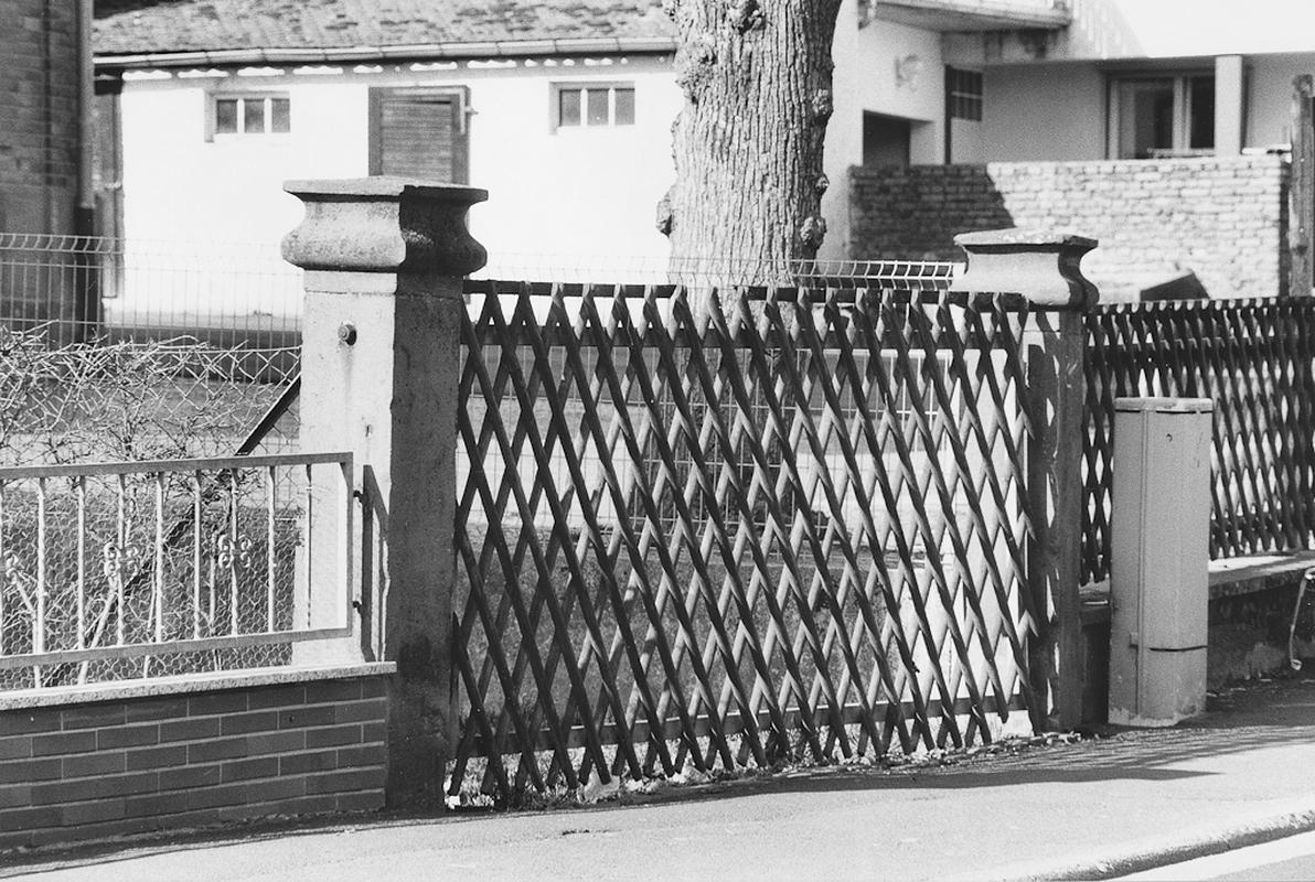 Einfriedung des Hofes durch ein modernes Eisengitter zwischen zwei barocken Sandsteinpfosten mit stilisiertem Pinienzapfenabschluss.