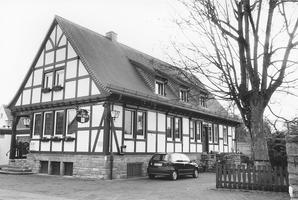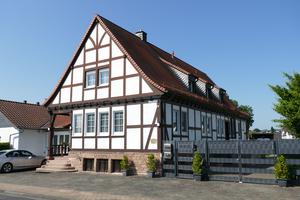 Eingeschossiger, giebelständiger Fachwerkbau auf rustiziertem Kellersockel mit ausgebautem Satteldach und verschieferten Schleppgauben. Erschliessung über eine halbrunde Sandsteintreppe in eine kleine offene Vorhalle. Schlichtes, historisierendes Fachwerk mit Bezügen zu den dörflichen Fachwerkformen der Gegend. Das dekorative Element des Hauses stellt die leicht vorkragende Rähmzone mit farbig angelegten Füllhölzern dar.