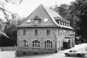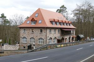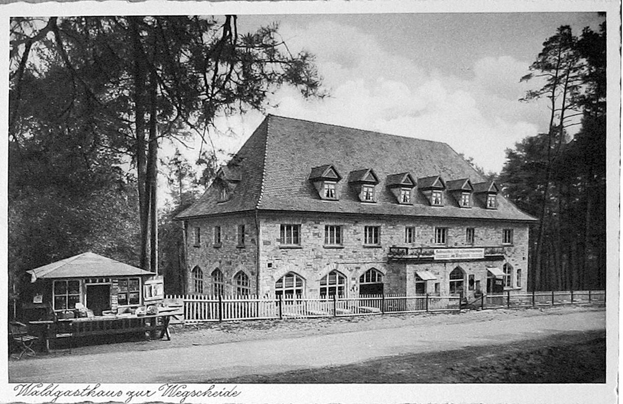 Ab 1911 entstand auf dem Wegscheideküppel eine Barackensiedlung für rund 9000 Soldaten, die auf dem Truppenübungsplatz Wegscheide / Bad Orb für den Ersten Weltkrieg ausgebildet wurden. Auf der gegenüberliegenden Straßenseite standen Offiziersunterkünfte und das Kasino. Im Zuge der Entmilitarisierung richtete man 1921 in dem Kasino eine Ausflugsgaststätte ein, die 1925 abbrannte. Bereits ein Jahr später, 1926, wurde das heutige Gebäude nach Plänen des Architekten J. Neu aus Bad Orb für den Inhaber der Gaststätte, Philipp Bernjus im Heimatstil mit starken Anklängen an den Expressionismus neu errichtet. Mit der Einrichtung des Stalag IX B Wegscheide im August 1939 wurde das Gebäude abermals als Offizierskasino genutzt. Auf dem Parkplatz stand eine Unterkunft für das Wachpersonal. Traufständiger, zweigeschossiger Sandsteinbau mit sieben Achsen, im Erdgeschoss große, spitzgiebelige Fenster. Alle Fenster zwei- oder dreiflügelig mit Sprossenteilung. Erschließung in der Mittelachse der Fassade unter einem breiten Portalvorbau mit Balkon, flankiert von je einem dreiteiligen Fenster mit spitzgiebeligem Abschluss. Hohes Walmdach mit Aufschieblingen und stehenden Gauben. Das Gebäude blieb trotz wechselnder Geschichte weitgehend original erhalten und zählt mit dem Bahnhof und der Villa Würzburger Straße 57 zu den Beispielen expressionistischer Architektur in der für Bad Orb typischen Variante. Es ist daher Kulturdenkmal und Bestandteil der Sachgesamtheit Lager Wegscheide.