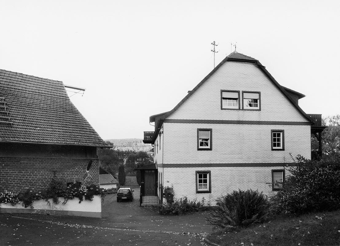 Zweigeschossiges Wohnhaus mit Mühlengebäude um 1710. Auf niedrigem Sandsteinsockel zwei Fachwerkgeschosse, das Fachwerk mit breiten Rundschindeln verkleidet. Krüppelwalmdach mit breiten Schleppgauben.