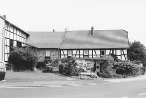 Sämtliche Baukörper gruppieren sich locker um einen großen Hof in prägnanter Lage an der Durchfahrtsstraße. Zweigeschossiges Fachwerkhaus auf flachem Sandsteinsockel, vierzoniger Bau in Zierfachwerk mit Mannfiguren, profilierter Rähm und leicht gebogenen Diagonalstreben, Krüppelwalmdach mit Aufschiebling.