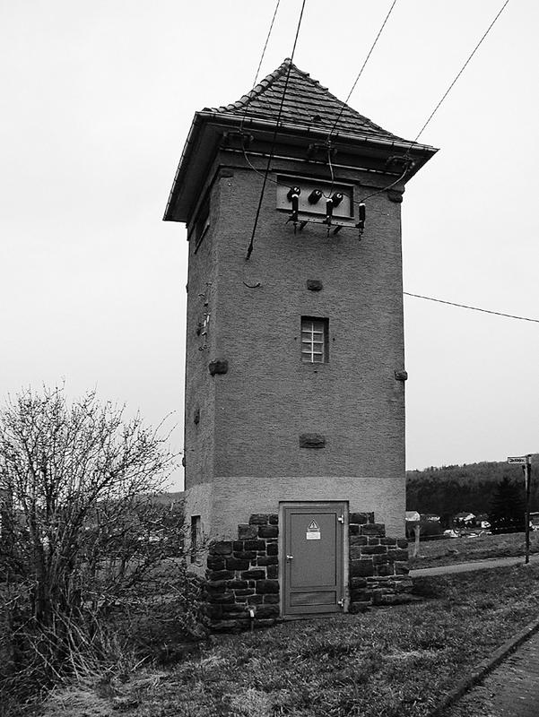 Verputzter Trafoturm der Bauserie aus den 1920er Jahren auf rustiziertem Sandsteinsockel, der den Eingang akzentuiert. Zeltdach mit Aufschiebling, gedeckt mit Bieberschwänzen. Einzelne Rustikaquader als Dekor im Putz. Der damals beliebte Heimatschutzstil prägte die erste Serie von Trafotürmen im gesamten Kreisgebiet.