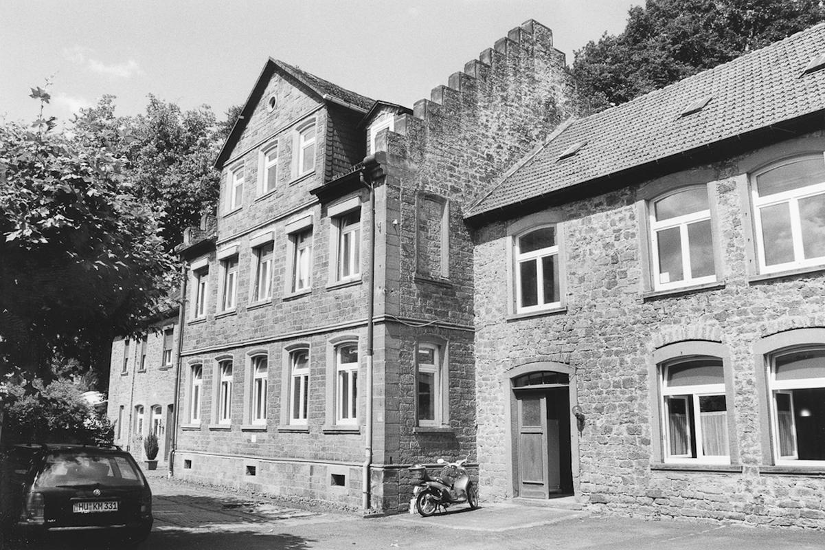 Traufständiger, zweigeschossiger und fünfachsiger Massivbau von 1859 in spätklassizistischen Formen. Der repräsentative Bau mit Treppengiebeln, dreiachsigem Zwerchhaus und Okulusfenster, steht auf einem hohem Kellersockel risalitartig zwischen zwei flankierenden, langgestreckten Seitenflügeln vor. Während der Mittelbau mit Sandsteinquadern verblendet wurde, bestehen die niedrigeren Seitenflügel aus Bruchsteinmauerwerk. Alle Tür- und Fenstergewände in Werkstein mit abgefasten Gewänden, in den etwas später errichteten Seitenflügeln mit Stichbögen. Im Inneren der Räume schöne gußeiserne Stützen mit Kapitellen erhalten.