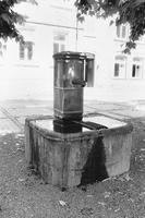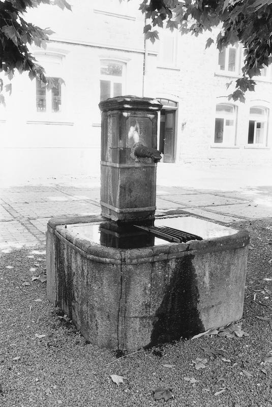 Der Brunnen, inschriftlich datiert auf 1859, besteht aus einem abgerundeten, rechteckigen Brunnentrog, einem Brunnenpfosten mit profilierter Abschlussplatte und gußeisernem Ausguss in Form eines Chimärenkopfes.