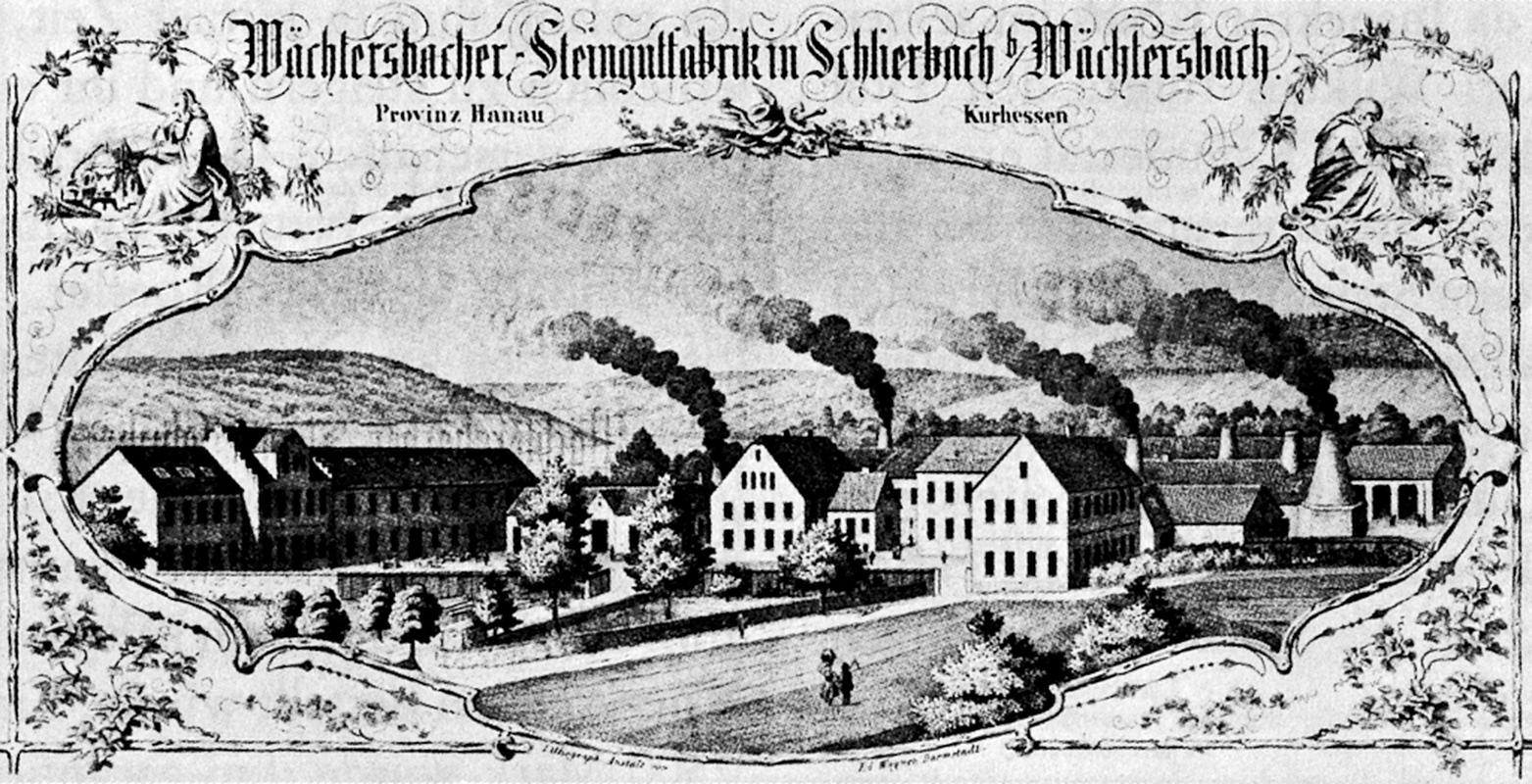 Am 17.5.1833 verkaufte Konrad Hoffmann jun. seine bei Schlierbach an der Bracht gelegene Mühle samt Wasserkraft und zugehörigem Gelände an den Gesellschafter Mülot, der sie 1837 an Wächtersbach weiter veräußerte. 1834 begann die Produktion in Schlierbach. Das Fabrikanwesen bestand aus dem zweigeschossigen Mühlengebäude mit drei Mahlgängen, einem Magazingebäude und Stallungen, dem Brennhaus mit Ofen, der Sécherie (Trocknerei, in der die Steingutmasse eingedickt wurde) und etlichen Grundstücken. 1856 übernahm Graf Ferdinand Maximilian zu Ysenburg-Wächtersbach die Fabrik ganz und ließ sie zwischen 1858 und 1860 ausbauen. Die Zufahrt zur Fabrik wurde um diese Zeit als Lindenallee angelegt, die heute noch zum großen Teil erhalten ist Das repräsentativste Gebäude der heutigen Fabrikanlage, das Direktoren- und Speichergebäude, entstand 1859 und schließt den Bering nach Norden ab. zu diesem Zeitpunkt wurden noch die Mühlengebäude zur Steingutherstellung genutzt. Zwischen 1870 und 1920 wurden Fachwerkgebäude im spätklassizistischen Stil für die Verwaltung, Produktion und Materiallagerung errichtet. Ein großer Brennofen mit Schornstein sowie Hallen in Ziegelbauweise entstanden um 1900. Weitere Fabrikationshallen wurden in den 1950er Jahren und nach einem Brand 1968 errichtet.