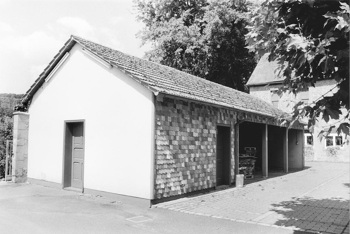 Neben der Einfahrt eingeschossiger Schuppen, der in die Anfangszeit der Fabrik datiert, traufseitig teilweise mit bunten dünnen Keramikplatten in Art der für die Gegend typischen Schindeln behängt. Diese "Keramikschindeln“ sind ein frühes Produkt der Keramikwerke und kommen ebenfalls in Restbeständen an dem Haus Wächtersbacher Str. 58 vor.