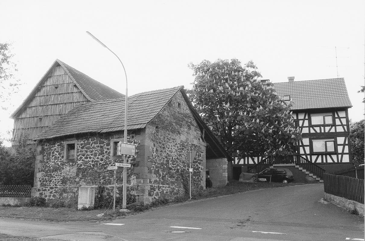 In leichter Hanglage am Ortseingang große Dreiseithofanlage. Zweigeschossiges Wohnhaus in schlichtem Sichtfachwerk, traufseitige Erschliessung in der zentralen Achse über zweiläufige Treppe, im Türsturz inschriftlich auf 1831 datiert, hohes Satteldach mit Aufschiebling. Anschliessend eingeschossiges Stallgebäude mit angeschlepptem Satteldach und Fachwerkkniestock. Rechtwinklig dazu Scheune mit massivem Sockel und verbrettertem Straßengiebel. Als Abschluss wieder traufständig zur Straße eingeschossiges Gebäude aus Lungenbasalt mit Eckquaderung und Gewänden aus Sandstein. Schöne, ungestört erhaltene Hofanlage, die aus historischen Gründen als Sachgesamtheit geschützt ist.