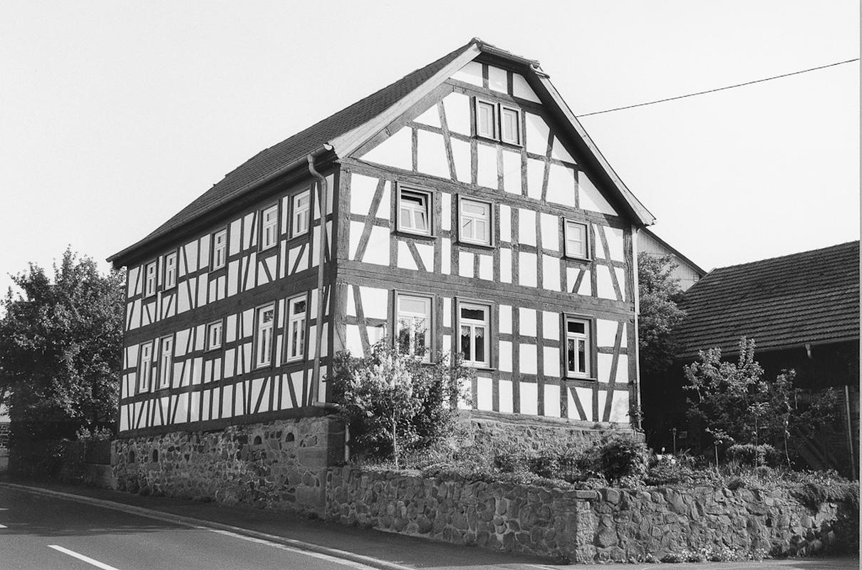 In markanter Lage große Hofanlage von 1847, die das Ortsbild nachhaltig prägt. Das traufständige, zweigeschossige Wohnhaus auf Basaltsockel mit Eckquaderung in Sandstein, dort Datierung 1847. Darauf zwei Geschosse in einfachem Sichtfachwerk mit Doppelständern, Diagonalstreben, Krüppelwalmdach mit kleinem Aufschiebling. Alle Fenster originalgetreu als Galgenfenster restauriert, im Sockelgeschoss für die Entstehungszeit typische halbrunde Kellerfenster in Sandstein. Parallel dazu im Hof breitgelagerte Stallscheune mit Lauterbacher Scheunentor, Erdgeschoss aus Basalt, Kniestock und Scheuer mit Langschindeln verkleidet. Im Hof schöner Bauerngarten. Der sehr gut erhaltene Hof ist aus historischen Gründen als Sachgesamtheit geschützt.