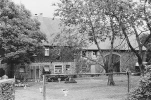 Auf großer Parzelle freistehende Streckhofanlage, traufständig zur Straße. Zweigeschossiges Wohnhaus um 1890, Stallteil im Erdgeschoss in Mischmaterial: Mauern in Basalt, Sandsteingewände und Überfangbögen in Backstein, im Obergeschoss ist unter der Verschindelung konstruktives Fachwerk zu erwarten. Daran angeschlossen große Stallscheune aus Basalt mit Sandsteingewänden, im vorderen Teil zweigeschossiger Stallteil, im hinteren Teil Scheune, großes Einfahrtstor mit Segmentbogenabschluss in Sandstein. Beide Gebäude unter getrennten Satteldächern.