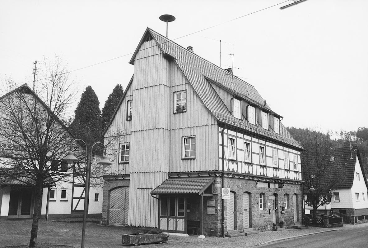 In zentraler Ortslage zweigeschossiger, traufständiger Rathausbau aus dem ersten Viertel des 20. Jh. im Heimatschutzstil. Erdgeschoss in rustiziertem Sandstein, Obergeschoss in schlichtem Sichtfachwerk. Steiles Satteldach mit langer Schleppgaube. Straßenfassade sechsachsig, im Erdgeschoss Fenster und Türen mit Stichbögen. Westlich Schlauchturm.