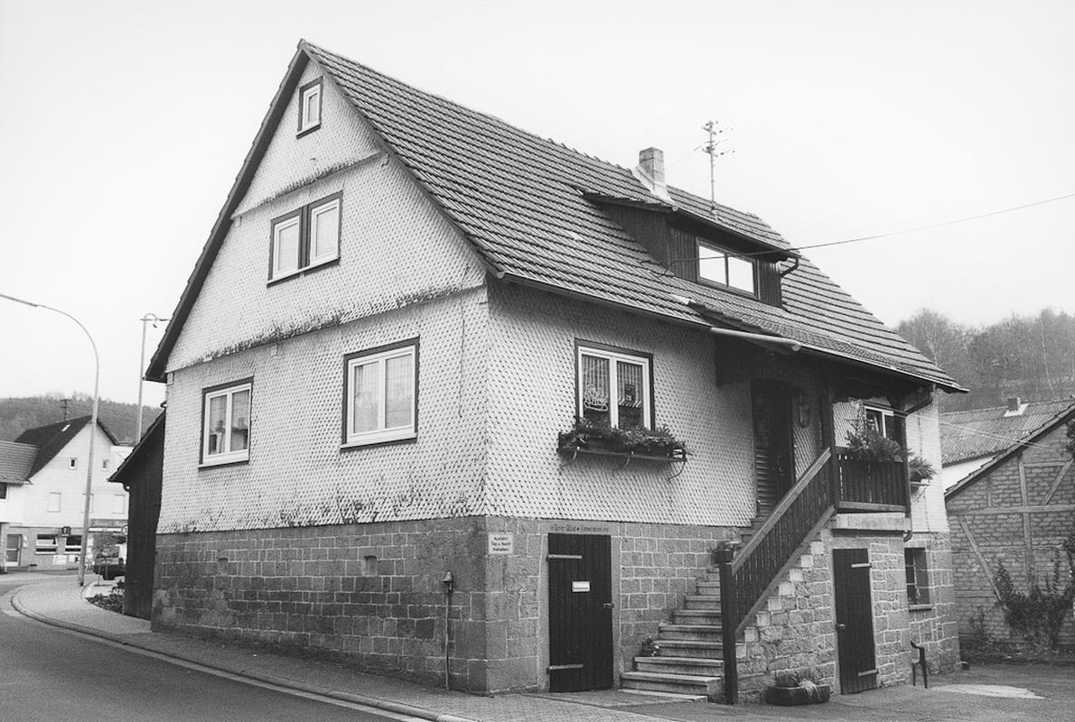 Zweiseithofanlage bestehend aus giebelständigem, eingeschossigem Wohnhaus auf massivem Kellergeschoss mit Stallnutzung und einläufigem Treppenaufgang unter Vordach, komplett mit Rundschindeln verkleidet. Gegenüber liegend giebelständige, große Stallscheune, datiert auf 1900, Erdgeschoss teilweise aus Sandsteinquadern, schlichtes Sichtfachwerk, teilweise verbrettert, Satteldach, zum Hof sehr weit angeschleppt.