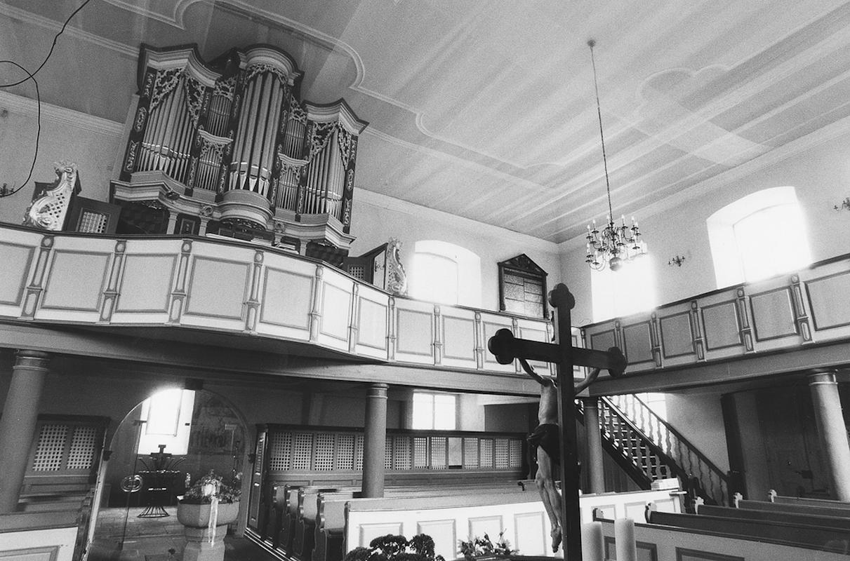 Im Inneren quergelagerter, lichter Kirchenraum mit stichgogigen Fenstern und zwei Türen an den Schmalseiten. Decke mit Spiegelgewölbe und Stuckleisten; auf Nord-, Ost- und Südseite umlaufende Emporen.