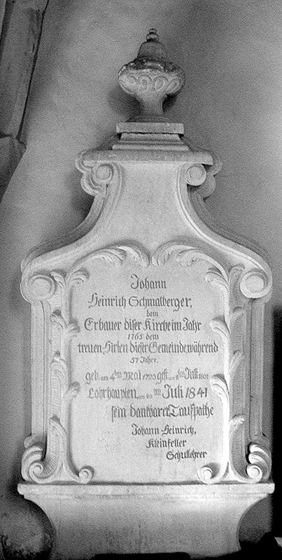 Im Chorturm zwei annähernd in ihrer Form identische barocke Grabplatten mit konkav eingezogenem Sockel, rechteckiger, von Ranken und Voluten gerahmter Schriftplatte, deren wiederum schmal eingezoge Schulter eine Krone bzw. eine Vase als Abschluss trägt. Die beiden Platten erinnern an die beiden Pfarrer Johannes Schmalberger (1717-1754) und an seinen Sohn Johann Heinrich Schmalberger (1754-1807), in dessen Amtszeit die Kirche neu errichtet wurde. Die Grabplatte Johann Heinrichs wurde vermutlich 1841 umgearbeitet, da der Vasenaufsatz offensichtlich eine spätere Zutat ist.