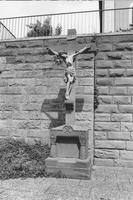 Sandsteinkruzifix am Fuß des Kirchhügels aus der Erbauungszeit der Kirche um 1900. Sockel in neoromanischen Formen mit Dreiviertelsäulchen und Korbkapitellen, die eine Deckplatte tragen, aus deren Rand Alpha, Omega und Christusmonogramm plastisch ausgearbeitet sind. Die im Stil der Spätromanik dargestellte Christusfigur und das Namensschild in hellerem Sandstein.