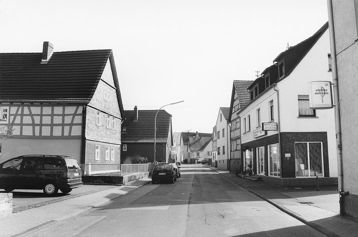 Die Bebauung der Hauptstraße besteht aus eng aneinandergereihten, winkelförmigen Hofanlagen auf tiefen Grundstücken mit großen, giebelständigen Wohnhäusern und großen Scheunen, meist mit einem kleinen Garten. Der Großteil der Hofanlagen ist im späten 18. und frühen 19. Jahrhundert entstanden, der südliche Abschnitt stellt eine Ortserweiterung mit Hofanlagen Ende des 19. Jahrhunderts dar. Typische Bau- und Zierformen sind Mannfiguren mit und ohne Arme im Fachwerk, zwei kleine Fensterchen im Dachgeschoss und Flurfensterchen seitlich der asymmetrisch gesetzten Hauseingänge. Die Dorferweiterungen um 1900 zeugen mit ihren für die ganze Gegend typischen polychromen Klinkerhäusern von dem durch die Industrialisierung gestiegenen Wohlstand der Bevölkerung. Für Gewände und Kellersockel wurde auch bei diesen Bauten der traditionelle heimische Buntsandstein verwandt.