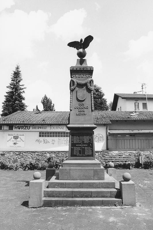Zur Erinnerung an die Kriege von 1866 und 1870/71 auf einem quadratischen, getrepptem Sockel ein Obelisk aus Sandstein, im Sockel die Namen der Gefallenen auf montierten, schwarzen Granitplatten, darüber Reliefs mit Reichskrone, Eichenlaub und der Aufschrift "Der Jugend zur Lehr" und die Ortsnamen Wörth, Sedan, Paris und Weissenburg. Als bekrönender Abschluss erhebt sich ein bronzener Reichsadler mit ausgestreckten Schwingen von einer Weltkugel aus Kupfer. Gestiftet wurde dieses Denkmal 1914 vom Krieger-Verein Somborn und wurde hergestellt von der Firma Kratz aus Aschaffenburg. Diese spät errichtete Siegessäule dokumentiert den kurz vor dem Ausbruch des ersten Weltkrieges vorhandenen Nationalismus.