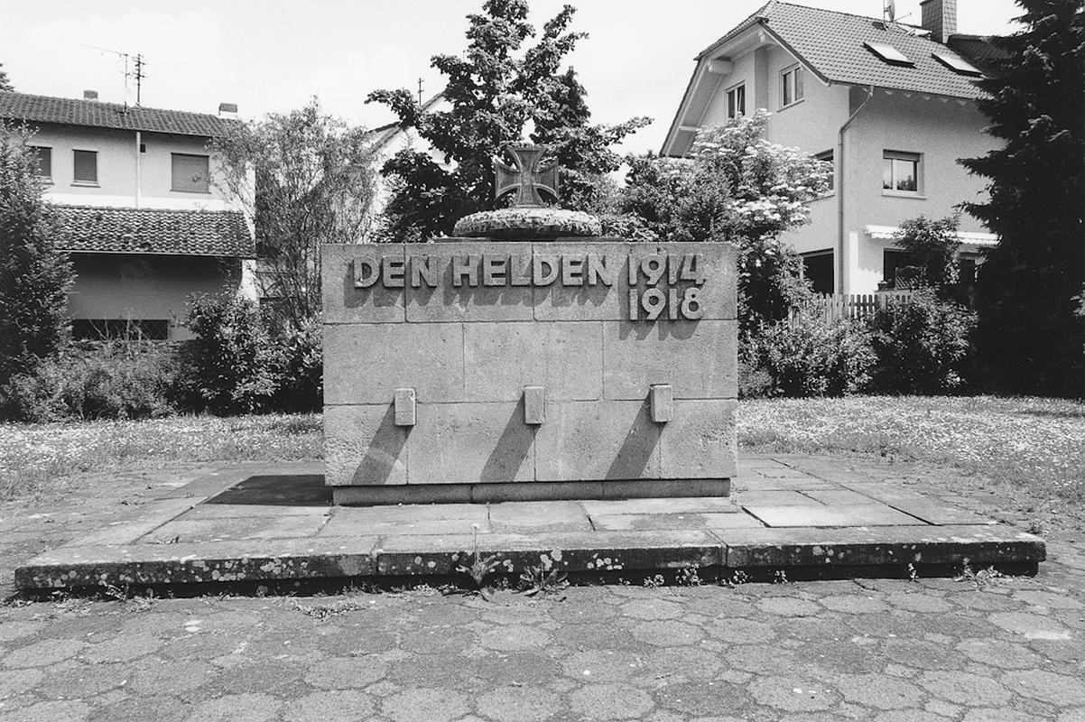 Schlichtes Kriegerdenkmal für die Gefallenen des 1. Weltkriegs als rechteckige Blockarchitektur aus rotem Konglomeratgestein auf flachem, großen Sockel. Auf der Vorderseite als Relief "Den Helden 1914-1918", auf der Rückseite die Namen der Gefallenen eingraviert, an den Seiten lateinische Kreuze als Flachrelief. Auf dem altartartigem Block liegender Eichenkranz und Eisernes Kreuz aus Bronze.