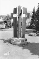 Das Denkmal für die Opfer des 2. Weltkriegs, ausgeführt als moderne, dreidimensionale Kreuzskulptur aus Bronze in aufgelösten Formen auf runder Sandsteinbasis, in die aus Bronzebuchstaben die Worte "Den Opfern von Krieg und Gewalt 1939-1945" eingelassen sind.