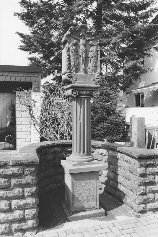 Bildstock aus Sandstein in spätbarocken Formen. Kannelierte Säule mit ionischem Kapitell und Abakus auf einem quadratischen Sockel mit Plinthe, darauf eine hochrechteckige Sandsteinplatte in geschwungenen Formen mit einer Kreuzigungsgruppe, darunter das Bibelzitat: "Weib siehe deinen Sohn Sohn siehe deine Mutter". Im Sockel die Inschrift "Wir beten dich an oh Christe Jesu und benedeien dich denn durch dein hlg. Kreuz hast du die Welt erlöst". Im Gegensatz zu den späteren Standartkreuzen ein individuell gestalteter Bildstock um 1800.