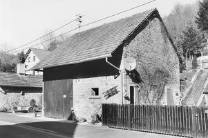 Traufständige Scheune aus Sandsteinquadern mit Eckquaderung und integriertem Stallteil mit Fenster- und Türgewänden in Sandstein und großem Einfahrtstor. Giebel in Backstein, Satteldach mit angeschlepptem Vordach.