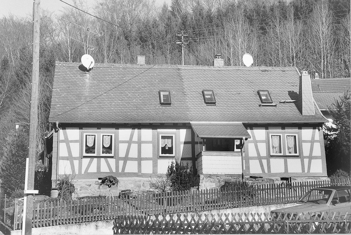 Eingeschossiges, traufständiges Wohnhaus in Hanglage oberhalb des Dorfes in schlichtem Fachwerk mit langen Diagonalstreben auf Kellergeschoss aus kräftigen Sandsteinquadern mit Kellerhals, 19. Jahrhundert. Erschliessung asymmetrisch traufseitig über Außentreppe. Rückseite teilweise in ziegeln unterfahren.