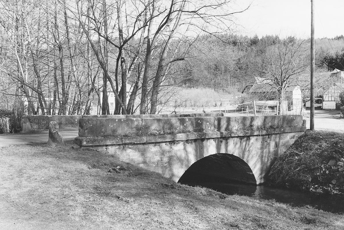 Über die Gründau einbogige Sandsteinbrücke aus Werksteinquadern mit Rundbogen in passend geschnittenen Formsteinen. Wangen aus liegenden Sandsteinquadern, gepickt und mit Randschlag, an jeder Seite Prellsteine. Die Brücke dürfte um die Mitte des 19. Jahrhunderts entstanden sein.