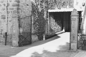 Hofeinfahrt mit Metallstaketentor und Torpfosten aus Betonguss mit abgefasten Kanten, eingeschnittenen Kreuzen und Polygonen und Kapitellen in Form eines Reliquiars, die den Pfosten das Aussehen eines Bildstocks geben, an der Plinthe die Datierung 1927. Sehr eigenwillige künstlerische Gestaltung eines alltäglichen Objektes.