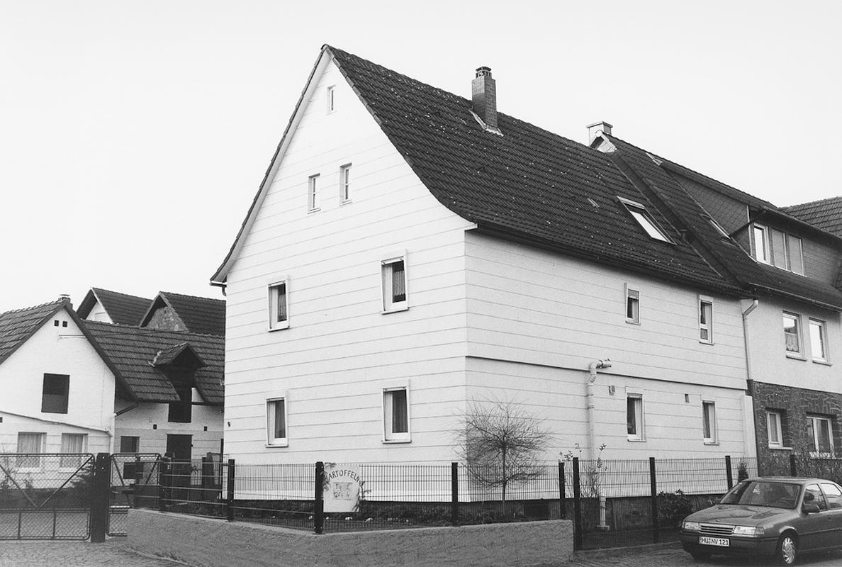 Traufständiges Fachwerkwohnhaus vermutlich aus dem frühen 18. Jahrhundert, eventuell auch noch aus dem 17. Jahrhundert. Unter der modernen Eternitverkleidung ist gut erhaltenes Fachwerk zu erwarten.