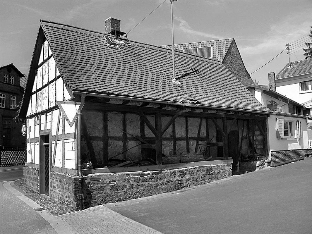 Altes Backhaus mit integrierter Viehwaage, seitlich offenes Balkengestell für die Aufbewahrung der alten Feuerwehrausrüstung bzw. als Ablage für Kuchenbleche. Eingeschossiger Fachwerkbau auf Sockel aus Sandstein, in den außenliegenden Deckengefachen Strohwickel sichtbar. Fassade erneuert, seitlich alte Lehmgefache.