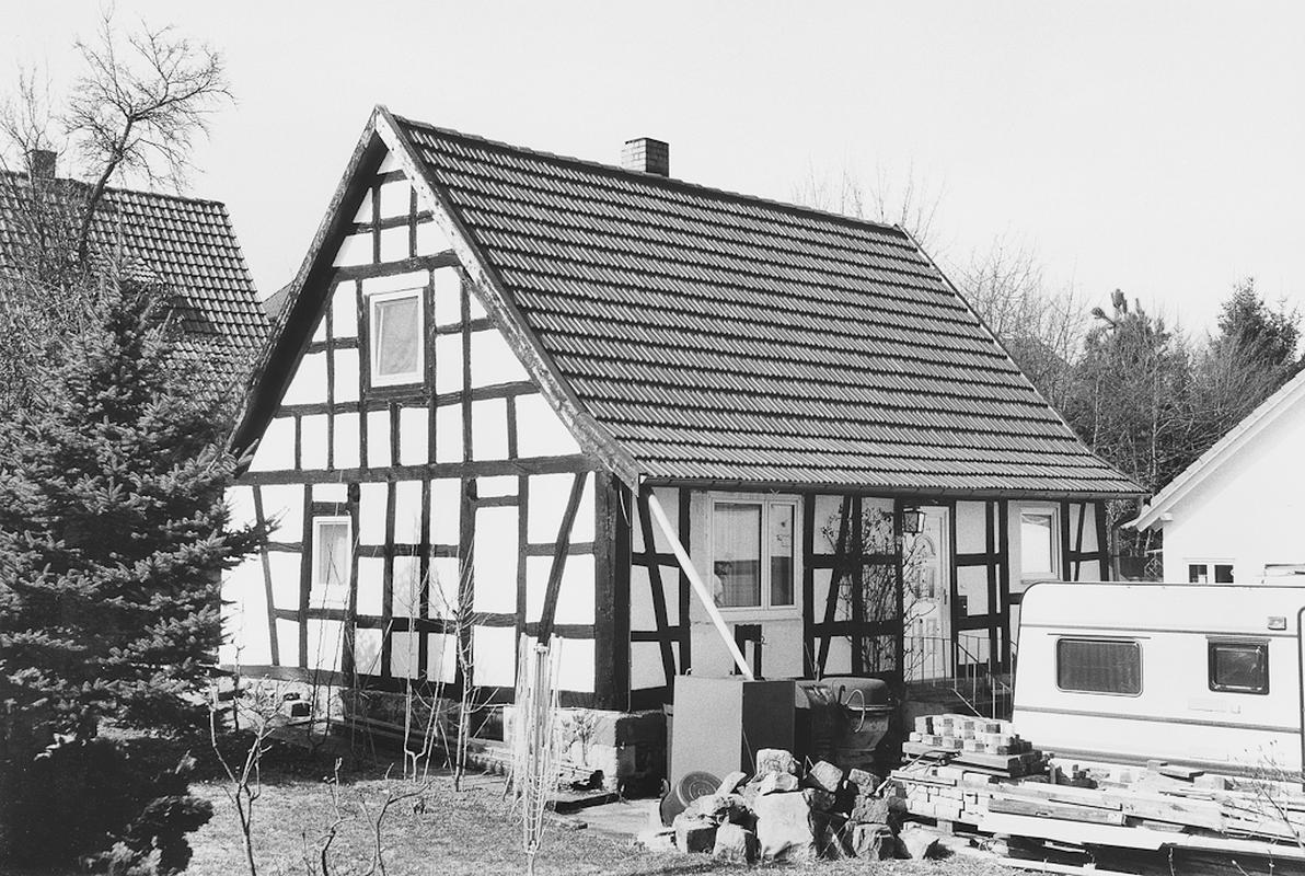 Traufständiges, eingeschossiges Kleinbauernhaus des 19. Jahrhunderts in schlichtem Fachwerk, Satteldach mit Aufschiebling. Traufseitige Erschliessung über einläufige Außentreppe.