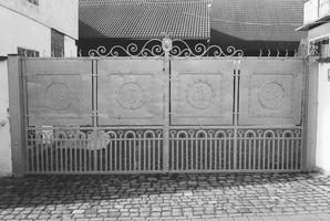 Ein originelles Eisentor von 1928, beschlagen mit gestanzten Blechplatten und ein passendes Mannpförtchen beschließen den Hof.