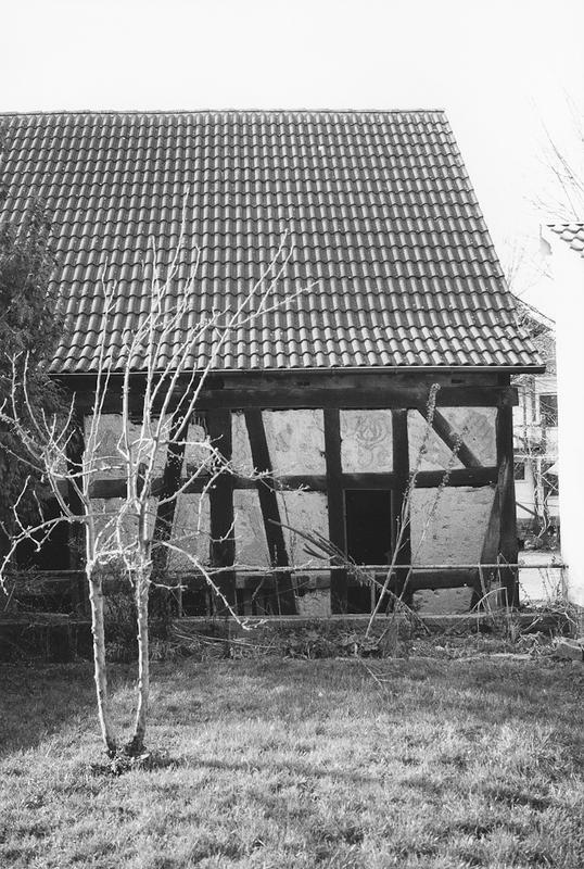 Freistehende, traufständige Fachwerkscheune aus dem 19. Jahrhundert, Gefache mit Lehmstakung und Lehmputz. An einigen Gefachen Reste von Stippputz mit floralem und oramentalen Mustern aus dem späten 19. Jahrhundert erhalten.