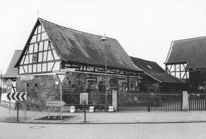 Alte Schmiede und Scheune. Giebelständiger Sandsteinbau mit Fachwerkdrempel und Giebel, Satteldach mit Aufschiebling. Die Scheune ist im Sturz auf 1806 datiert.
