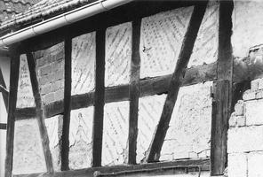 Fachwerkscheune aus dem 19. Jahrhundert mit originalen Lehm- und Ziegelgefachen, verziert mit Stippputz in geometrischen Mustern. Ausgefallenens Beispiel der ehemals typischen Verzierung von Scheunen. Da das Material sehr vergänglich ist, sind nur noch selten Reste von dem einst wohl ortsbildprägenden Stippputz an den Scheunen erhalten.