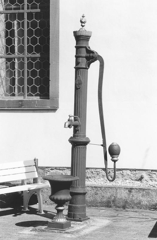 Gusseiserne Schwengelpumpe. Verzierung mit Kanneluren, Blattkranzabschluss und Amphorenbekrönung. Relikt der alten Wasserversorgung des Dorfes.