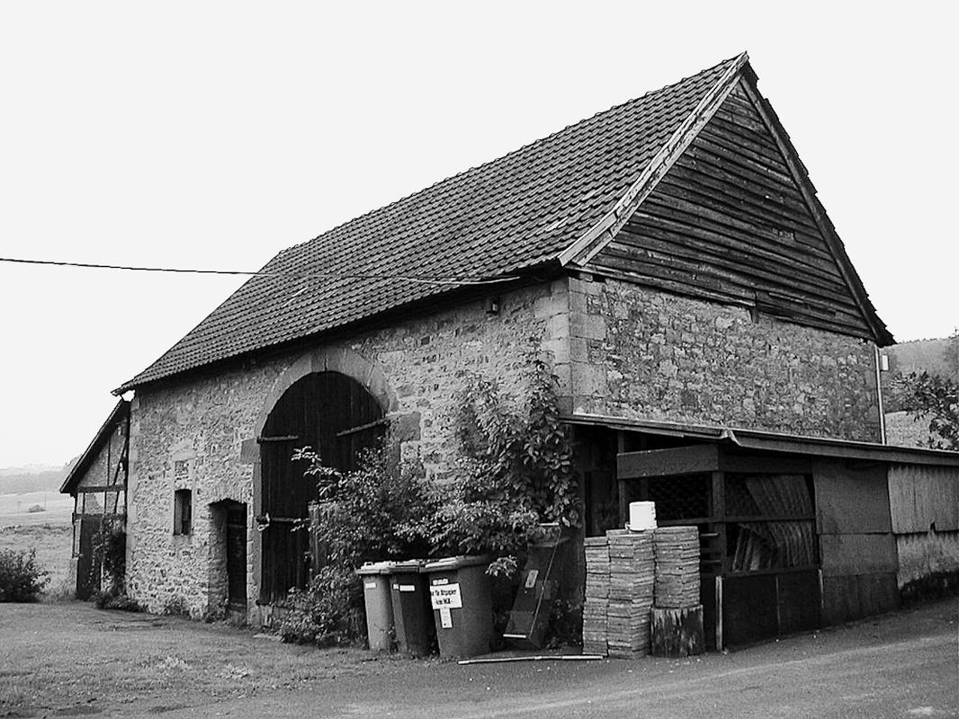 Sandsteinscheune mit Eckquaderung und großem Einfahrtstor mit Segmentbogenabschluss aus dem 18. Jahrhundert. Seitlich kleiner Fachwerkanbau. Zum Anwesen gehört im Garten ein kleines Gartenhaus mit Zeltdach.