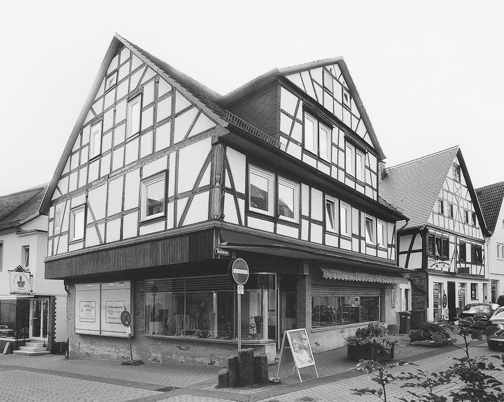 Bestes Wächtersbacher Beispiel dieser im 17. Jahrhundert verbreiteten Fachwerkdekoration Satteldach mit breitem Zwerchhaus modern. Das Erdgeschoss unschön durch Ladeneinbau völlig ausgeräumt.