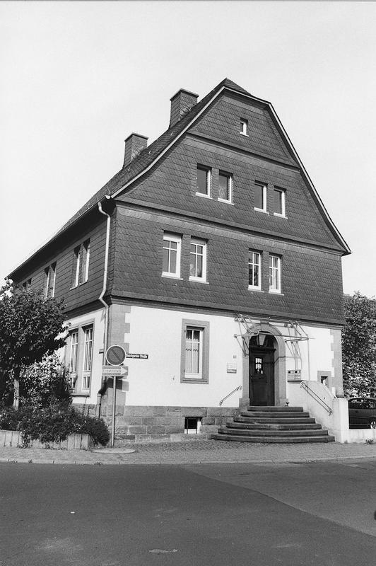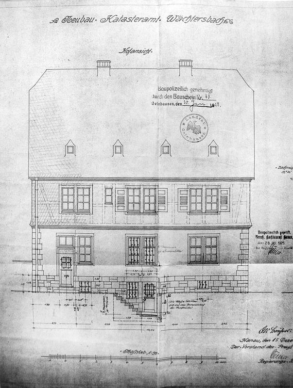 In Ecklage markanter, freistehende Bau in Formen des Heimatschutzstils, 1925 als Katasteramt gebaut. Das verputzte Erdgeschoss mit bossiertem Sockel, Eckquaderung und Gewänden aus Sandstein. Rundbogiger Hauseingang über einwangiger Außentreppe mit gerundeten Stufen. Das erste Obergeschoss und das hohe, zweigeschossige Krüppelwalmdach samt östlicher Schleppgaube mit Schiefer gedeckt. Der Typ des hessischen barocken Rathauses wird hier über den Heimatschutzstil wieder aufgenommen.