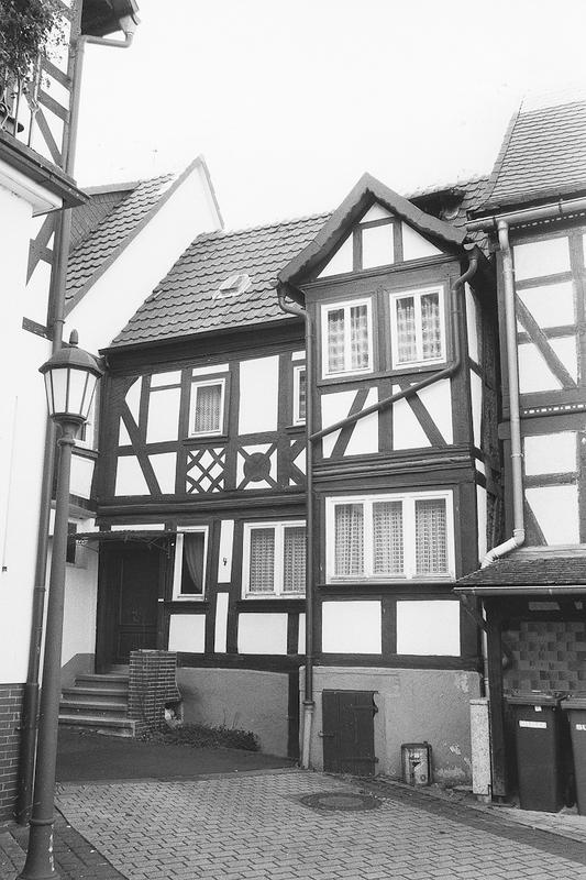 Schmales, traufständiges Wohnhaus aus der ersten Hälfte des 17. Jahrhunderts mit zwei Fachwerkgeschossen und seitlichem Altan auf halbhohem Keller. Im ersten Obergeschoss halbe Mannfigur, in den Brüstungsfeldern Raute mit eingeschriebenem Andreaskreuz und gekreuztes Schild, an beiden Hausteilen eine profilierte Schwelle.