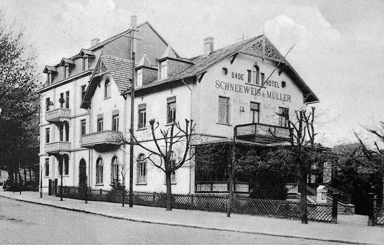 Im Jahre 1894/95 errichtete die Firma Schneeweiß und Müller, in deren Besitz sich seit 1859 die ehemalige Koch''sche Sol- Badeanstalt und seit 1875 auf Pachtbasis der Salinenbetrieb befand, das erste Badehotel am Burgring. In den Jahren 1905/06 wurde das zweigeschossige Hotel durch einen repräsentativen dreigeschossigen Anbau erweitert, das alte Gebäude aufgestockt und dem Anbau äußerlich angepasst. Die innere Geschossebenen und die Fenster des älteren Baus blieben erhalten. Dreigeschossiger Massivbau in markanter Lage gegenüber dem Kurpark. Die Fassaden des Gebäudes durch Balkons mit reich verzierten Brüstungen aus Formsteinen auf volutenförmigen Konsolen gegliedert. Im Inneren ist der Eingangsbereich weitgehend mit seiner originalen Ausstattung erhalten. Typischer Bau im Bäderstil aus der Frühzeit der Kurstadt Bad Orb.