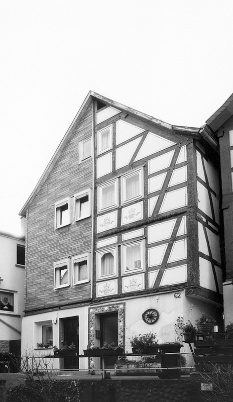 Auf einer vorgezogenen Terrasse wie beim Nachbarhaus ein nachträglich geteiltes, giebelständiges und dreigeschossiges Fachwerkhaus mit massivem Erdgeschoss. Die zu Bändern gereihten vier Fenster weisen auf eine Entstehungszeit im späten 18. Jahrhundert hin. Satteldach mit Aufschiebling.