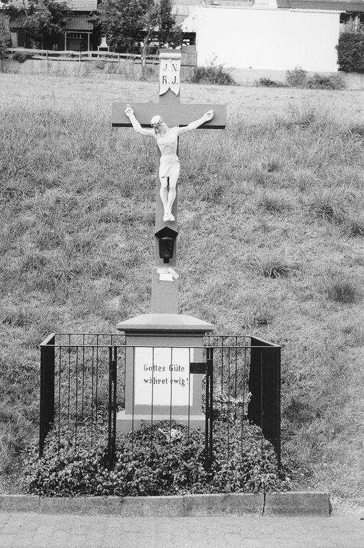 Schlichtes Sandsteinkreuz mit weiß gefasstem Corpus Christi auf Postament mit Inschriftenplatte "Gottes Güte währet ewig!“. Andachtsbild an der in den 1830er Jahren ausgebauten Ludwigstraße, die nach Aufenau führt. Das Kreuz dürfte aus der Mitte des 19. Jahrhunderts stammen.