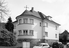 Auf großem Eckgrundstück repräsentative Zweifamilienvilla, vermutlich nach einem Entwurf des Architekten Rudolf Breuer um 1930 gebaut. Zweigeschossiger, durch Vor- und Rücksprünge gegliederter Putzbau mit halbrund vorspringendem Kopfbau auf hohem Sokkelgeschoss in rustiziertem Sandstein. Leichte Betonung der Horizontalen durch Sandsteinsohlbänke an den Fensterbändern des Kopfbaus und sparsam eingesetzte Geschosssimsbänder. Für die Zeit typisch die Eckfenster mit geknickten Stürzen und die profilierten, breiten Ortgänge unter den Walm- und Zeltdächern. Sehr schöner und gut erhaltener Bau aus der großen Zeit der Kurstadt Bad Orb.