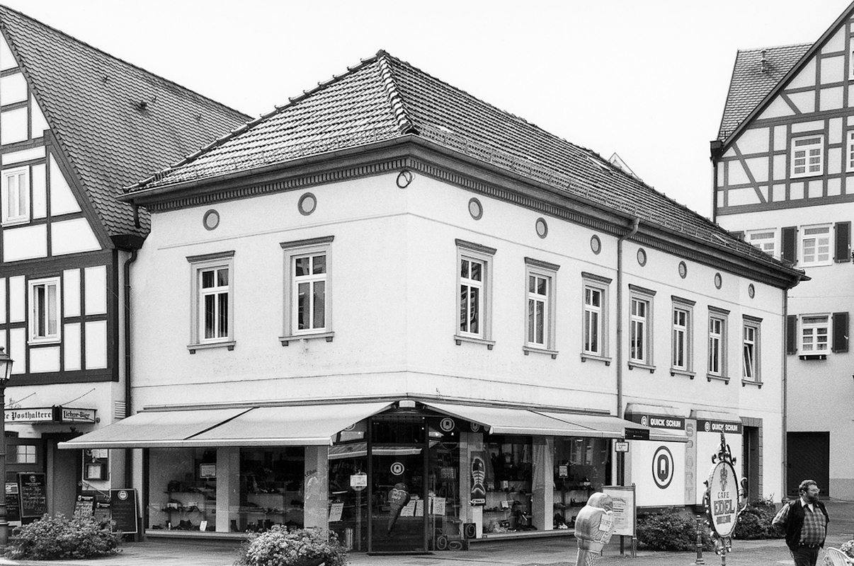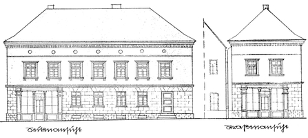 Zweigeschossiger, klassizistischer Putzbau aus der Mitte des 19. Jahrhunderts in Ecklage. Über dem modern veränderten Erdgeschoss ein klar gegliedertes Obergeschoss mit sieben bzw. zwei Achsen aus hochrechteckigen, zweiflügeligen Fenstern mit profilierter Rahmung und gerader Verdachung, Betonung der Horizontalen durch kantige, schmale Stockwerkssimse, Drempel mit Scheibenfries und Zahnschnittband unter dem Kranzgesims des Walmdaches. In seiner vom heimischen Fachwerk geprägten Umgebung auffälliger Bau im "bayerischen“ klassizistischen Stil, der ansonsten den öffentlichen Bauten vorbehalten war. Trotz der seit 1938 sukzessive ausgeführten unschönen Veränderungen im Erdgeschoss ein beeindruckendes Gebäude.
