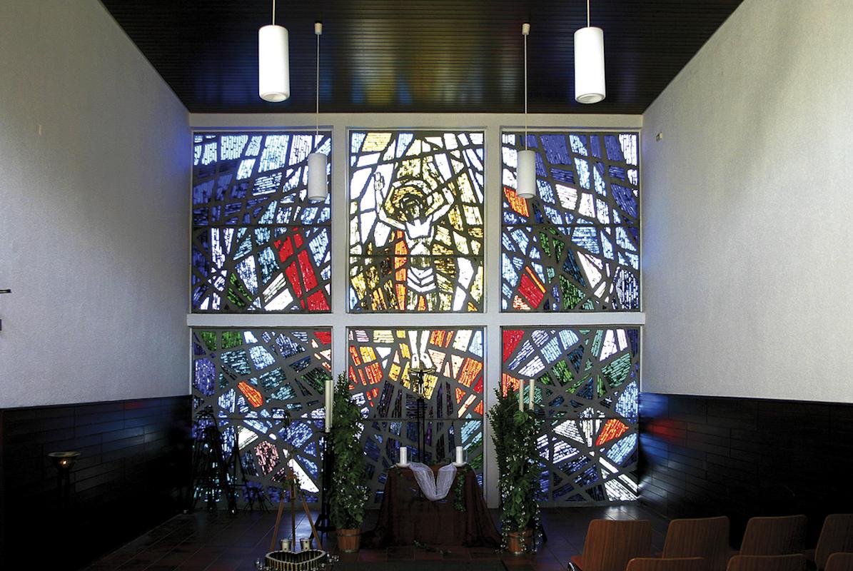 Im hoch über dem Ort liegenden Friedhof wurde zu Beginn der siebziger Jahre eine neue Trauerhalle in schlichten kubischen Formen errichtet. Die nordwestliche Fassade wurde komplett als Glasbetonfenster errichtet. Der bekannte Groß-Auheimer Künstler August Peukert entwarf das Fenster mit einer Darstellung der Auferstehung Jesu. Wie auch in der Trauerhalle von Bad Orb beeindrucken neben seiner kraftvollen Darstellung die leuchten Farben, die vom dunklen Blau des Firmamentes zum hellen Zentrum mit der Figur Christi hinleiten. Aufgrund der bedeutenden künstlerischen Qualität ist die Betonglaswand als Sachteil geschützt.