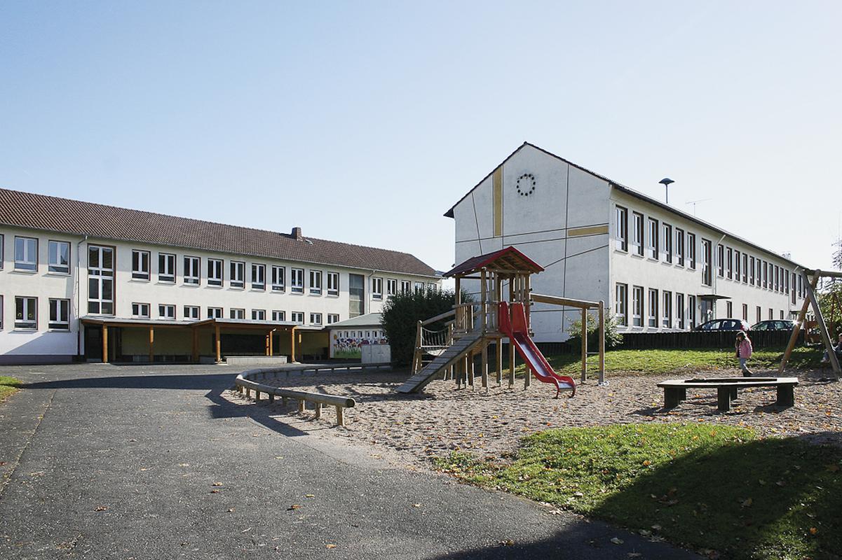 Hoch am Hang wurde in den Jahren 1954/55 am südwestlichen Ortsrand der fünfte Schulbau Somborns errichtet. Zwei parallel gerichtete zweigeschossige Bauten mit Satteldächern werden durch einen eingeschossigen Trakt miteinander verbunden. Jeweils zwei Eingänge mit Schwingtüren gliedern die Gebäude, die mit ihren dreigeteilten Fenstern die typische Form der Schulneubauten aus dieser Zeit aufweisen. Zur qualitätvollen Ausstattung der Bauzeit gehören zwei ca. 1,50 x 4,00 Meter große Bleiglasfenster im Treppenhaus, die von heute bekannten Künstlern der Region entworfen wurden. Im vorderen Bau entwarf der Darmstädter Künstler Helmut Lander ein figürliches Fenster mit orientalischen Motiven in den typischen weichen Farbtönen der Fünziger Jahre. Helmut Lander, geb. 1924 in Weimar, kam 1951 nach Darmstadt und entwarf zunächst vorzugsweise Mosaíke, Beton- und Bleiglasfenster. Seit 1967 bevorzugt er plastische Arbeiten in verschiedenen Materialien. 1994 entwarf er nochmals für die Friedberger Stadtkirche das Bleiglasfenster "Ökumene". Mit seinen Arbeiten wurde er weit über die Grenzen Hessens berühmt und gehörte bis 1989 zum Vorstand der Darmstädter Sezession. Das Glasbild in Somborn zählt zu seinen frühesten Arbeiten. Ausgeführt wurde das Glasbild von der Firma Eichhorn aus Boppard, die auch die gewaltige Glaswand der Peter-Canisius-Kirche in Mainz-Gonsenheim errichtete.