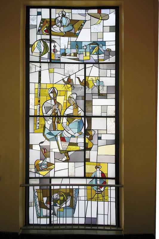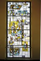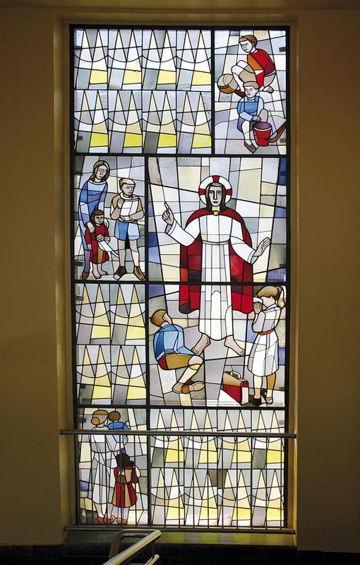 Das Bleiglasfenster des hinteren Gebäudes entwarf der Groß-Auheimer Künstler August Peukert, der später auch in Bad Orb und Freigericht-Horbach die Entwürfe für die Fensterwände der Trauerhallen lieferte. In seinem Entwurf steht Jesus als Lehrer und Beschützer der Schulkinder im Mittelpunkt. Er benutzt die gleiche Farbskala wie Lander, setzt aber die für ihn typischen leuchtenden Farben mit warmen Rot - und Blautönen ein.