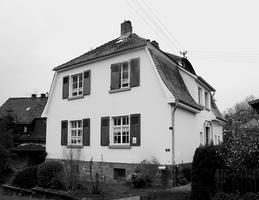 Auf großem Gartengrundstück original erhaltenes, eingeschossiges Wohnhaus mit hohem, abgewalmten Mansarddach. Zweiachsiger Putzbau auf Sandsteinsockel, die Fenster mit Sprossengliederung und Klappläden erhalten. Die für den Heimatschutzstil typische Dachdeckung in roten Bieberschwänzen ist ebenfalls noch vorhanden.