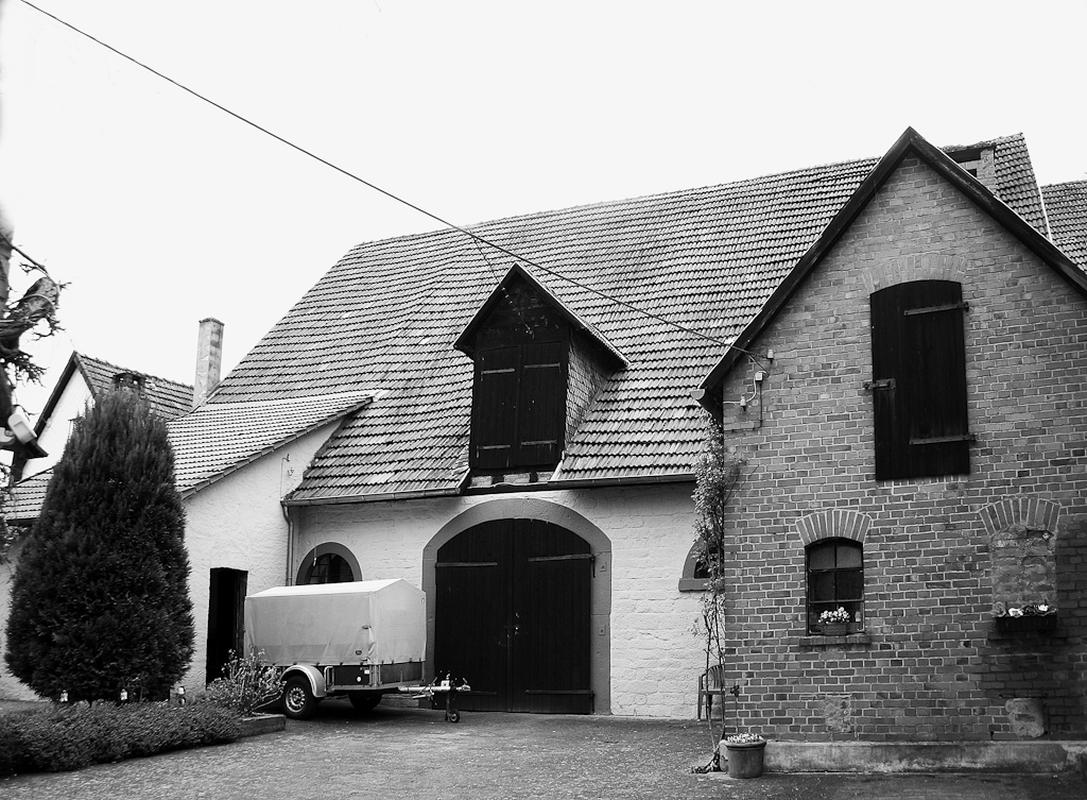 Große Sandsteinscheune um 1800, zum ehemaligen Ysenburgischen Schafhof gehörig. Zur Straße großes, zentral angeordnetes rundbogiges Tor, seitlich Mannpforte und halber Okulus in Werksteingewänden. Darüber im riesigen Satteldach großes Gaubenhaus als Ladeluke. Zur Bachseite fünf halbe Okuli in Werksteingewänden. Nördlich Werkstattgebäude in Klinkern um 1900 angebaut.
